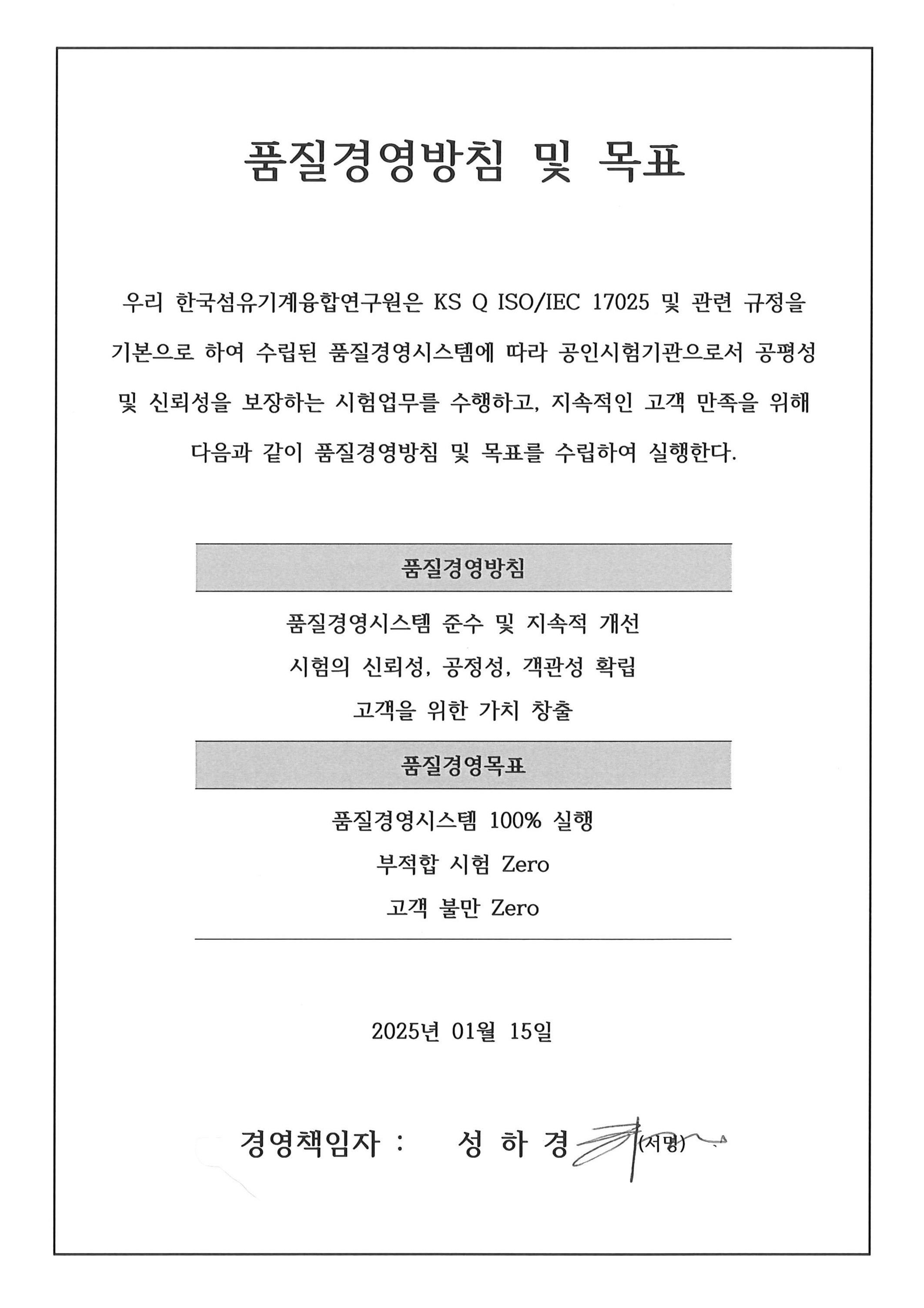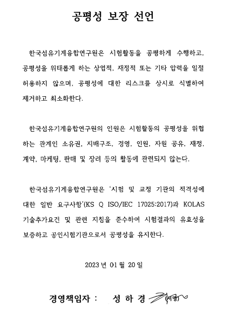 KOTMI (Korea Textile Machinery Convergence Research Institute) was certified as a KOLAS accredited testing laboratory in 2008 and has since provided testing services to clients.
